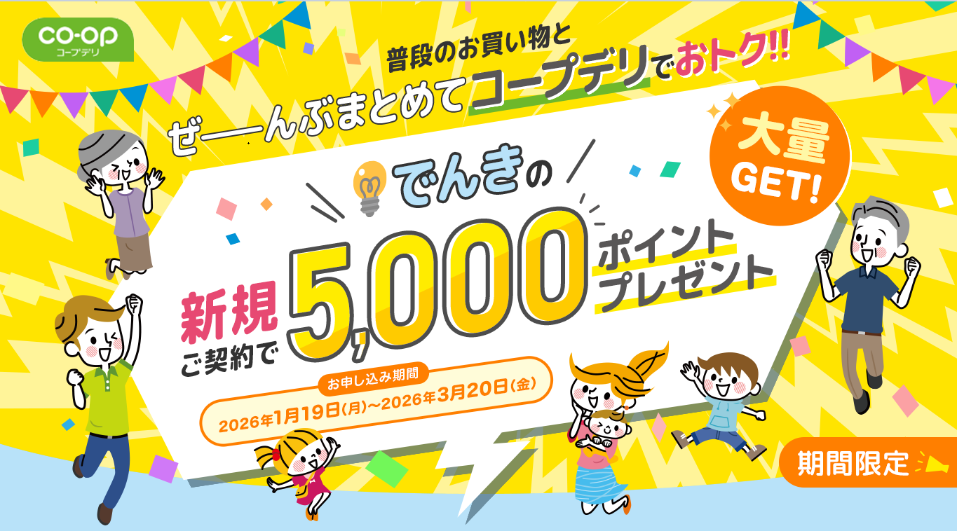 2026年1月19日(月)から2026年3月20日(金)の期間でコープデリでんきに新規ご契約いただいた方に5,000ポイントを進呈します。