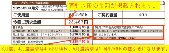 ①2026年2月検針分(3月度請求:4月6日引落)と3月検針分(4月度請求:5月7日引落)で4.5円/kWh(税込)、4月検針分(5月度請求:月5日引落)で1.5円/kWh(税込)の値引きをします。