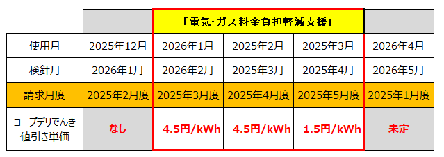 政府は「電気・ガス料金負担軽減支援事業」として、2026年2月、3月、4月の3か月における検針分について、電気・ガス料金の値引きを行う旨の発表がありました。そのため、「コープデリでんき」の使用量に応じた料金の値引きを2026年2月検針分(3月度請求分)から4月検針分(5月度請求分)まで実施します。