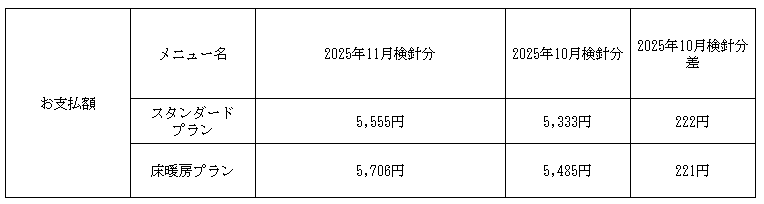 ※11月検針分原料費調整単価は、12月度請求分(2026年1月5日口座振替分)に反映します。コープデリガスは、政府による電気・ガス料金負担軽減支援により、前月度の10月検針分で値引き単価(8.0円/m³)が適用されています。